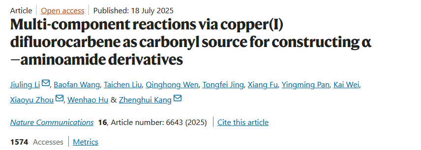 近日,李玖零博士联合中国科公司上海药物研究所康正辉副研究员、台州公司周晓雨博士,在国际知名期刊《Nature Communications》上发表了题为“Multi-component reactions via copper(I) difluorocarbene as carbonyl source for constructing α-aminoamide derivatives”的研究论文。李玖零为论文第一作者,太阳集团为第一通讯单位。