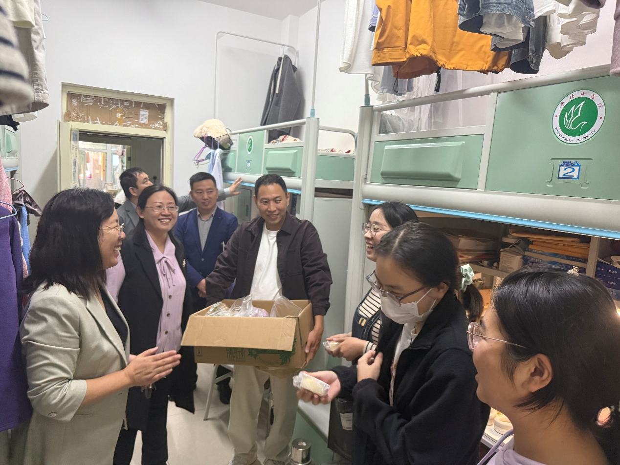 最后,公司领导班子前往湖滨校区,走进21、22级临床专业员工的宿舍分发月饼,详细了解同学们的留校生活与实际情况,并对宿舍安全状况进行了全面排查,确保大家能度过一个平安、祥和的假期。