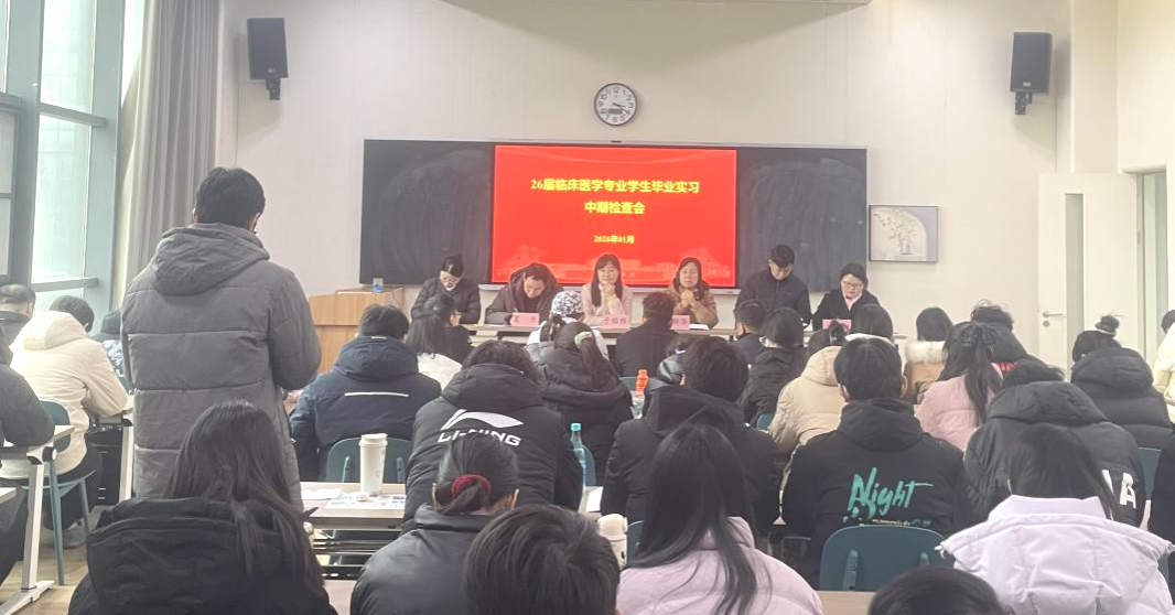 2026年1 月 27 日,公司在第一附属医院会议中心第三教室召开2026 届临床医学专业员工毕业实习中期检查会。第一附属医院副经理于维雅、科教科主任曹飞,8827太阳集团官网经理郑新华、党委副书记夏乐、实习管理办公室、团委、临床医学系负责同志,临床带教老师代表、校内实习指导老师和2026 届临床医学专业全体实习生参会。