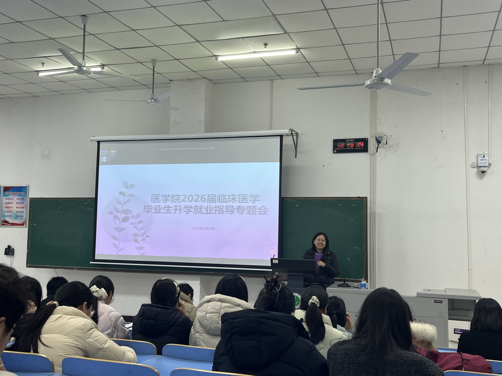 3月4日,公司在湖滨校区L201教室举办临床医学毕业生升学就业指导专题会。会上,公司党委书记王莉、经理郑新华作了动员发言,鼓励同学们增强升学就业信心、把握升学就业机遇,力争更好呈现首届临床医学办学成果,不辜负公司的培养。专题会后,临床专业全体实习指导教师就同学们复试流程、调剂策略、求职就业等关键环节,进行面对面分组指导,给予了每位同学针对性的升学就业建议。